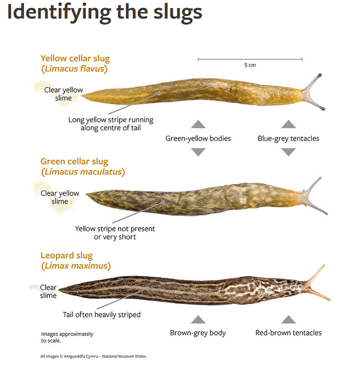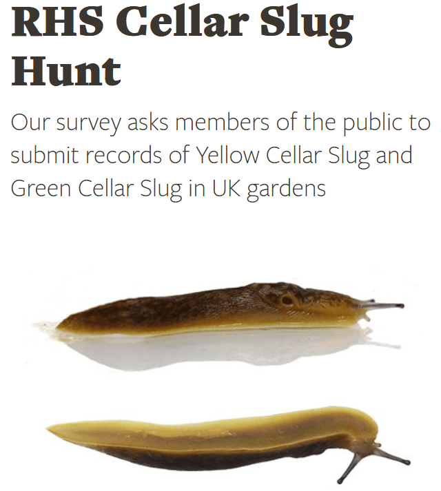 You can help with slug research! Look out for these: the yellow cellar slug (Limacus flavus) and the green cellar slug (Limacus maculatus), and report any to the Cellar Slug Survey. Neither are considered pests as they feed on rotting plant material, but researchers want to find out what impact the newer green cellar slug (seen in Britain since the 1970s) is having on the yellow cellar slug, which has been around much longer.