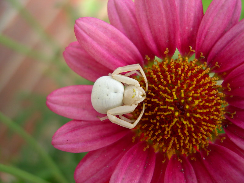 “white crab spider (Misumena vatia) on a flower” by mwcarruthers is licensed under CC BY 2.0.