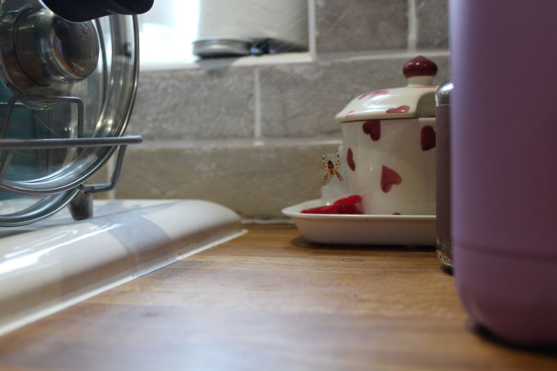 She made her web in a number of different places around the kitchen, some more successful and enduring than others. Up high in the corner of the ceiling, or above the cooker hood, were better spots than between the dirty cups by the draining board.
