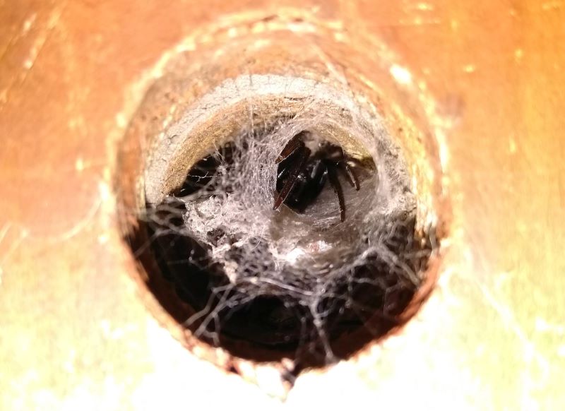 I peered into the circular hole in the door of my garden shed, past the radial silk strands which stretched out from it across the peeling wood paint. A little way inside I could see a collection of inky black legs pointing in my direction. It was impossible to tell how big the creature was, as most of the body was hidden in the darkness beyond. But the legs did look unusually long, for a garden spider.