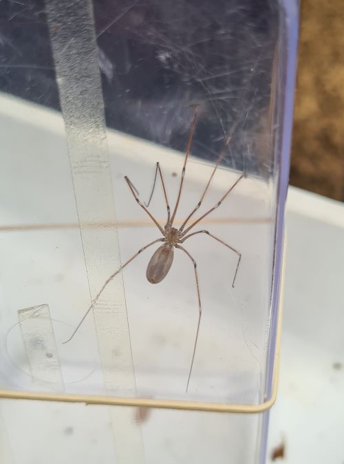 My three-year old was more interested in the collection of spiders Michael had brought with him, collected that morning in his own garden and shed. These included a beautiful, large and glossy noble false widow (Steatoda nobilis) and her close relative, a cupboard spider (Steatoda grossa), as well as a very large cellar spider (Pholcus phalangioides). These are often called Daddy Long-legs spiders, although that’s a little confusing as Daddy Long-legs is also a nickname sometimes given to harvestmen (a different type of arachnid) and also crane flies.
