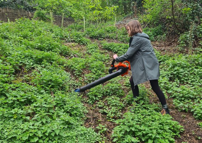 My six-year old and I were excited to try out the modified leaf blower. It had been converted into a minibeast hoover, with a net attached to the mouth to suck up and collect tiny creatures from the undergrowth. After running the contraption through a patch of nettles and along a woodpile, we emptied the contents into a tray to reveal several spiders, as well as springtails and a large number of confused woodlice. All of our finds were of course carefully released back into their habitats.